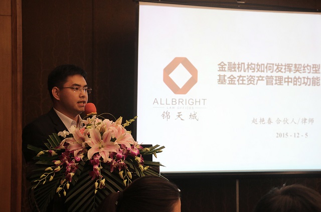 來自錦天城律師事務(wù)所的合伙人趙艷春律師首先為大家勾勒了契約型基金的發(fā)展歷程,他認(rèn)為《暫行辦法》的出臺對契約型基金的發(fā)展起到了重要作用,但隨之而來也有許多缺憾。首先因?yàn)樗侥蓟鸬怯涢T檻較低,后續(xù)面臨著如基金的投資范圍、銷售甚至基金管理公司的辦公場地沒有限制的問題;其次,像銀行、信托等金融機(jī)構(gòu)在基金業(yè)協(xié)會登記管理人資格,存在監(jiān)管上的沖突和障礙,最合適的方式是設(shè)立子公司;最后,從發(fā)展角度來看,后續(xù)的基金管理人資格登記會趨嚴(yán),包括實(shí)收資本的公示、失聯(lián)公示、信息披露、事后處罰等等。他著重指出,金融機(jī)構(gòu)運(yùn)用契約型私募的最大的風(fēng)險(xiǎn)不是業(yè)務(wù)風(fēng)險(xiǎn),而是政策風(fēng)險(xiǎn)。
