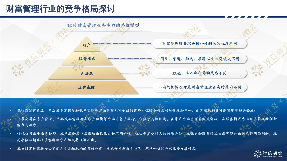 本次分享嘉賓為智信研究公司財(cái)富管理首席研究員孫陽。在分享過程中,孫陽老師提出了一種比較各類機(jī)構(gòu)財(cái)富管理業(yè)務(wù)能力的思維模型。